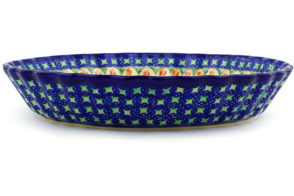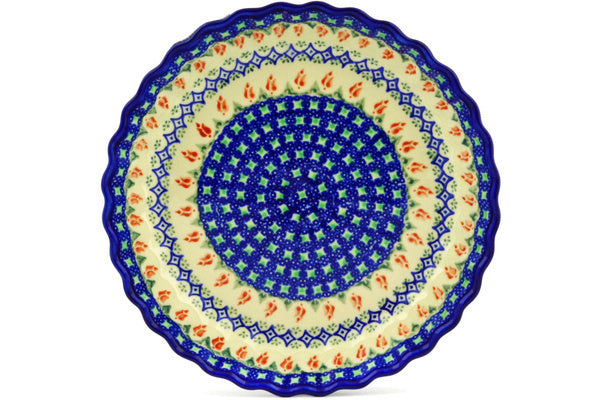 This Polish Pottery 10" Fluted Pie Dish - Tulips And Diamonds is handmade and handpainted by the Ceramika Bona factory in Boleslawiec, Poland.