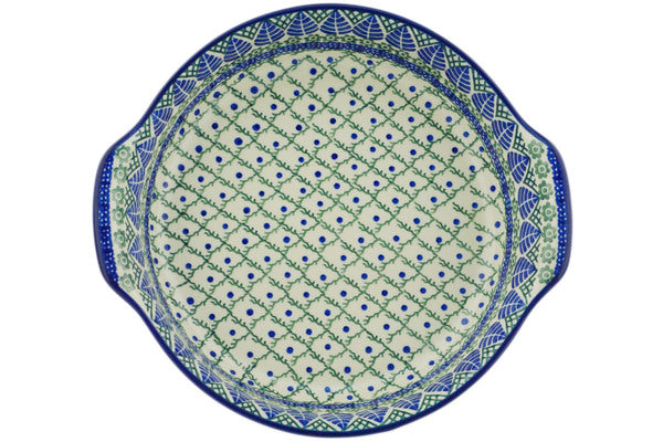 This Polish Pottery 11" Round Baker with Handles - Blue Alpine is handmade and handpainted by the Ceramika Artystyczna factory in Boleslawiec, Poland.