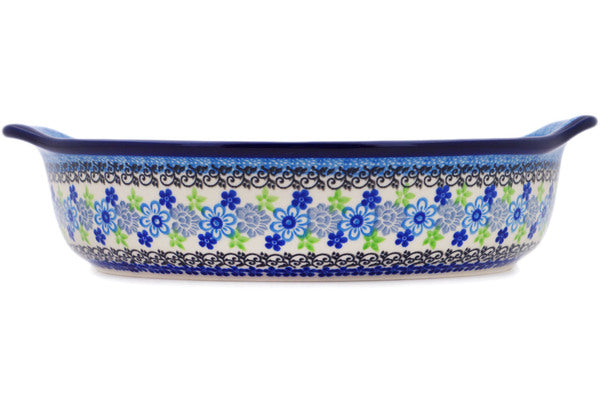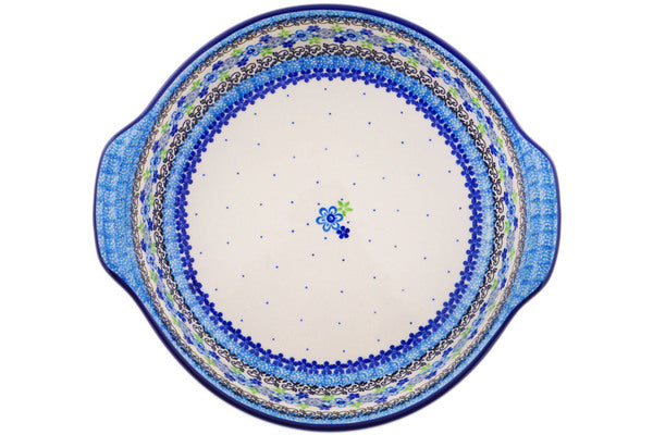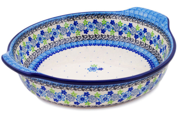 This Polish Pottery 11" Round Baker with Handles - Blue And Green Flower Dream is handmade and handpainted by the Ceramika Artystyczna factory in Boleslawiec, Poland.