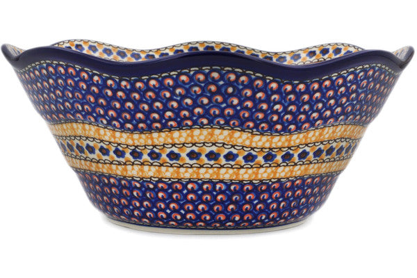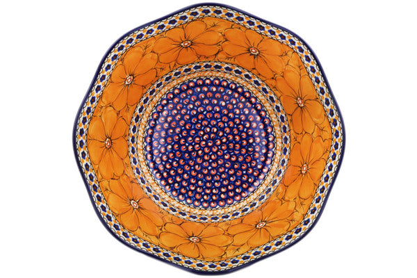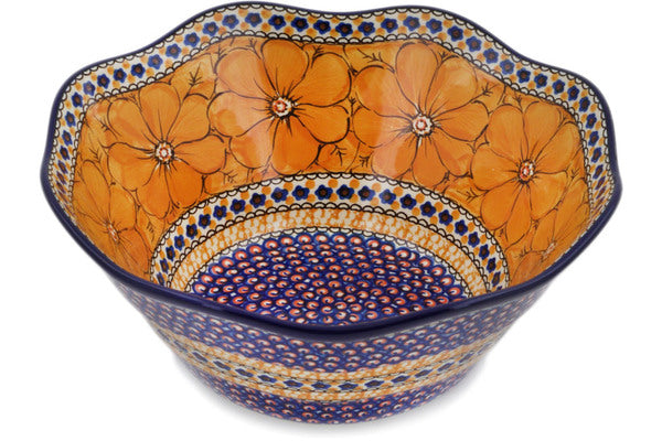This Polish Pottery 10" Scalloped Bowl - Marigold Dreams is handmade and handpainted by the Ceramika Artystyczna factory in Boleslawiec, Poland.