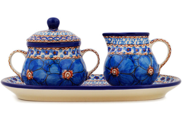 This Polish Pottery 10" Sugar and Creamer Set - Blue Poppies is handmade and handpainted by the Ceramika Artystyczna factory in Boleslawiec, Poland.