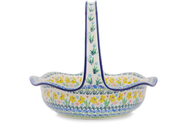 This Polish Pottery 11" Basket with Handle - Hopping In Love is handmade and handpainted by the Ceramika Artystyczna factory in Boleslawiec, Poland.