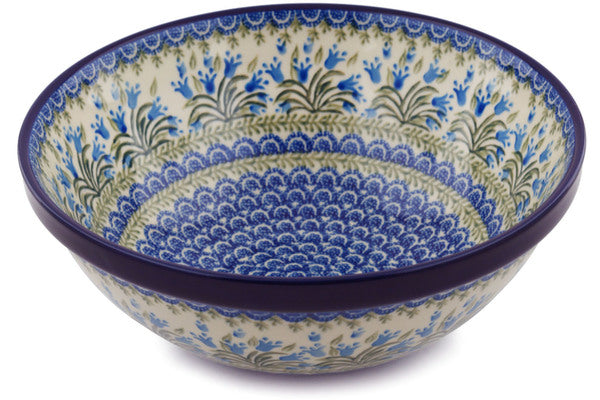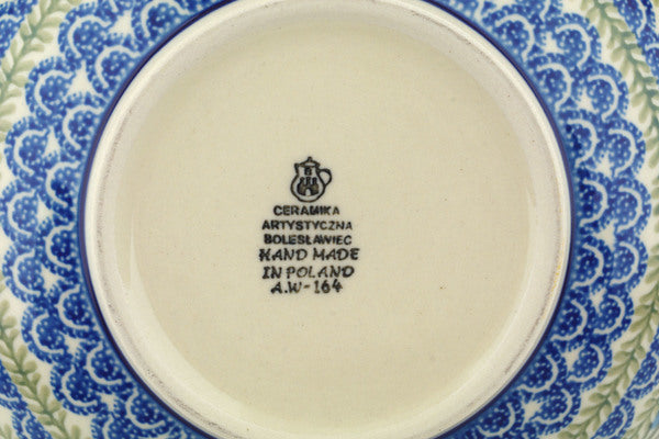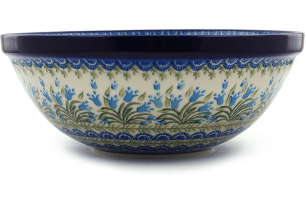 This Polish Pottery 11" Bowl - Feathery Bluebells is handmade and handpainted by the Ceramika Artystyczna factory in Boleslawiec, Poland.