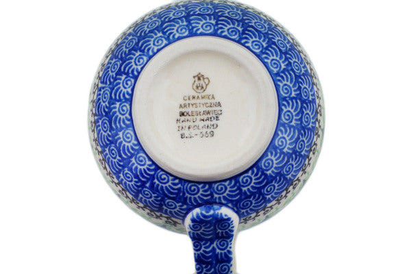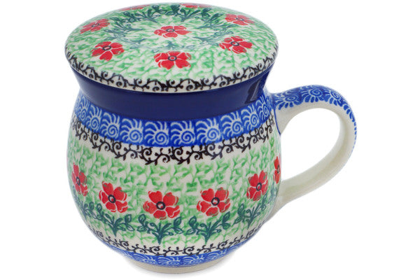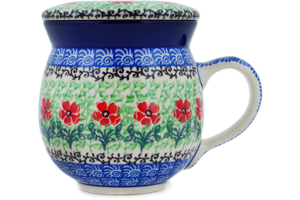 This Polish Pottery 11 oz Mug with Lid - Maraschino is handmade and handpainted by the Ceramika Artystyczna factory in Boleslawiec, Poland.