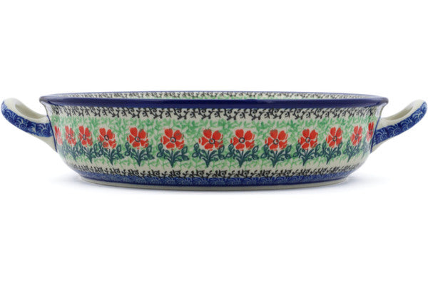 This Polish Pottery 11" Round Baker with Handles - Maraschino is handmade and handpainted by the Ceramika Artystyczna factory in Boleslawiec, Poland.