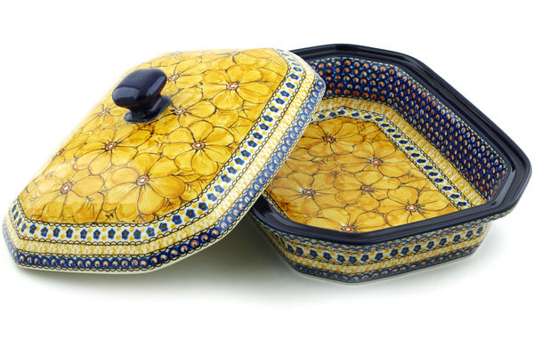 This Polish Pottery 12" Dish with Cover - Marigold Dreams is handmade and handpainted by the Ceramika Artystyczna factory in Boleslawiec, Poland.
