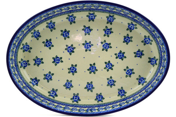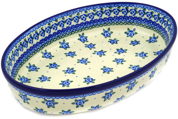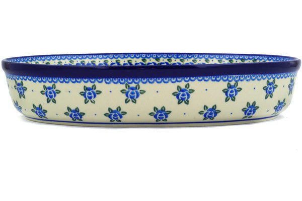 This Polish Pottery 12" Oval Baker - Bluebuds is handmade and handpainted by the Ceramika Artystyczna factory in Boleslawiec, Poland.