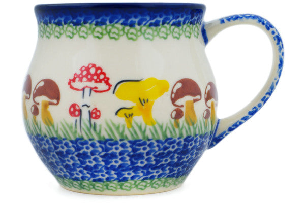 This Polish Pottery 12 oz Bubble Mug - Wild Mushroom Picking is handmade and handpainted by the Ceramika Nina factory in Boleslawiec, Poland.