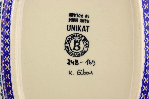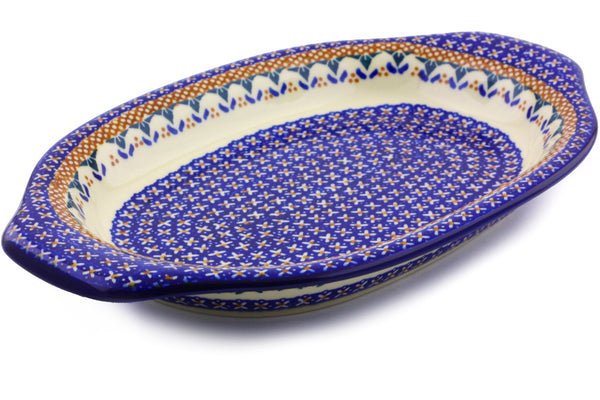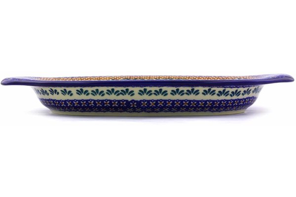 This Polish Pottery 12" Platter with Handles - Blue Cress is handmade and handpainted by the Ceramika Bona factory in Boleslawiec, Poland.
