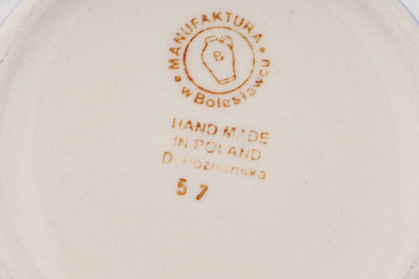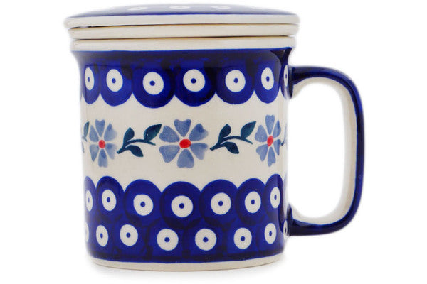 This Polish Pottery 13 oz Brewing Mug - Peacock Forget-Me-Not is handmade and handpainted by the Manufaktura factory in Boleslawiec, Poland.