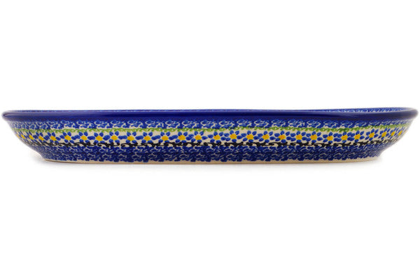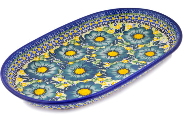 This Polish Pottery 13" Platter - Cadet Blue Flowers is handmade and handpainted by the Ceramika Bona factory in Boleslawiec, Poland.