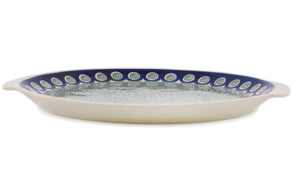 This Polish Pottery 13" Platter with Handles - Green Peacock Swirl is handmade and handpainted by the Ceramika Artystyczna factory in Boleslawiec, Poland.