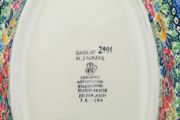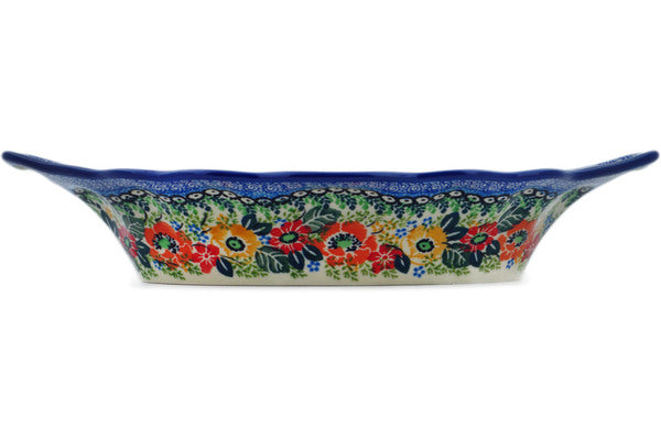 This Polish Pottery 13" Platter with Handles - Iris Meadow is handmade and handpainted by the Ceramika Artystyczna factory in Boleslawiec, Poland.