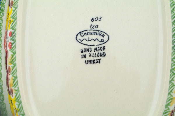 This Polish Pottery 13" Platter with Handles - Wild Mushroom Picking is handmade and handpainted by the Ceramika Nina factory in Boleslawiec, Poland.