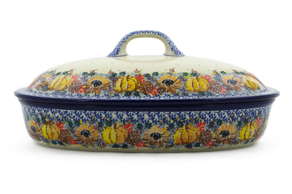 This Polish Pottery 14" Baker with Cover - Autumn Falling Leaves is handmade and handpainted by the Ceramika Artystyczna factory in Boleslawiec, Poland.