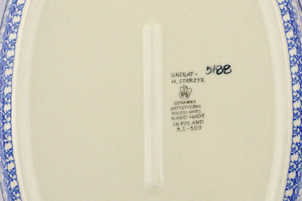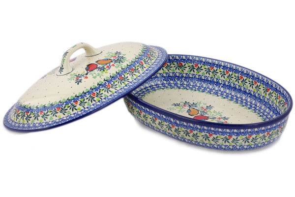 This Polish Pottery 14" Baker with Cover - Robin & Wren is handmade and handpainted by the Ceramika Artystyczna factory in Boleslawiec, Poland.