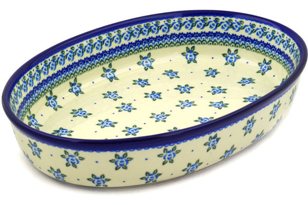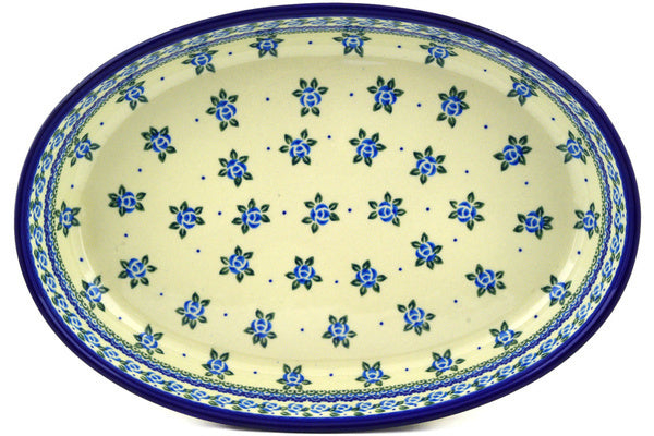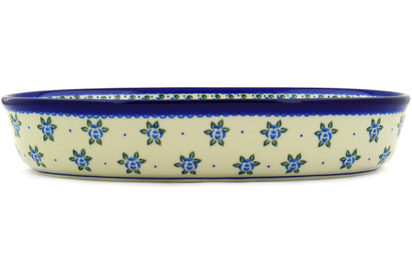 This Polish Pottery 14" Oval Baker - Bluebuds is handmade and handpainted by the Ceramika Artystyczna factory in Boleslawiec, Poland.