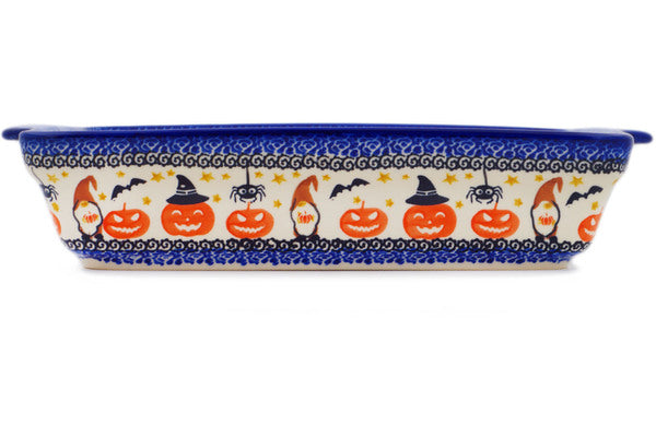 This Polish Pottery 15" Rectangular Baker with Handles - Harvest Haunt is handmade and handpainted by the Ceramika Nina factory in Boleslawiec, Poland.