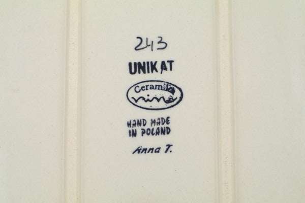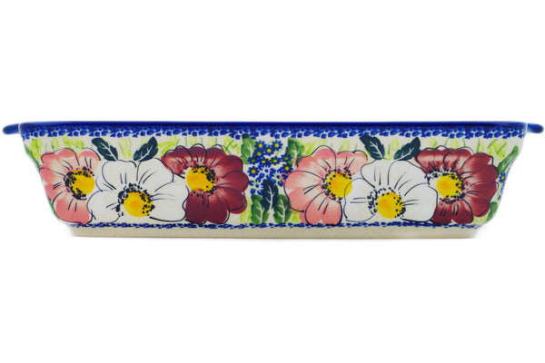 This Polish Pottery 15" Rectangular Baker with Handles - Maroon Blossoms is handmade and handpainted by the Ceramika Nina factory in Boleslawiec, Poland.