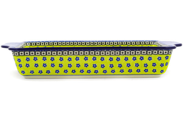 This Polish Pottery 15" Rectangular Baker with Handles - Sunburst Daisies is handmade and handpainted by the Ceramika Artystyczna factory in Boleslawiec, Poland.