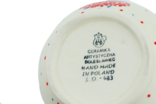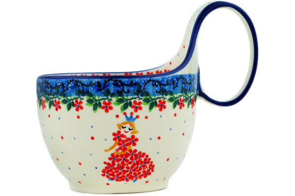 This Polish Pottery 6" Bowl with Loop-Handle - Princess In A Red Dress is handmade and handpainted by the Ceramika Artystyczna factory in Boleslawiec, Poland.