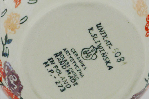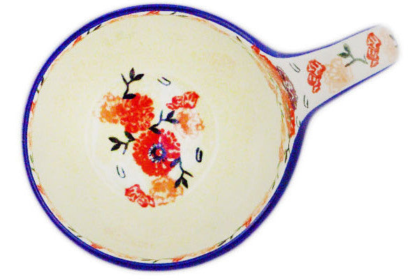This Polish Pottery 6" Bowl with Loop-Handle - Crimson Falling Flowers is handmade and handpainted by the Ceramika Artystyczna factory in Boleslawiec, Poland.
