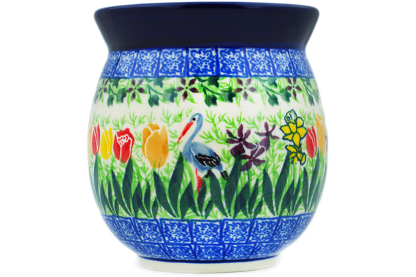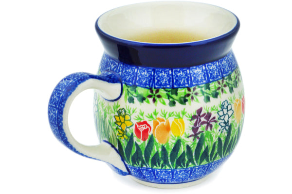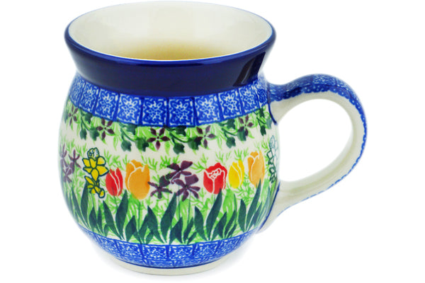 This Polish Pottery 16 oz Bubble Mug - Crane In Tulip Splendor is handmade and handpainted by the Ceramika Artystyczna factory in Boleslawiec, Poland.