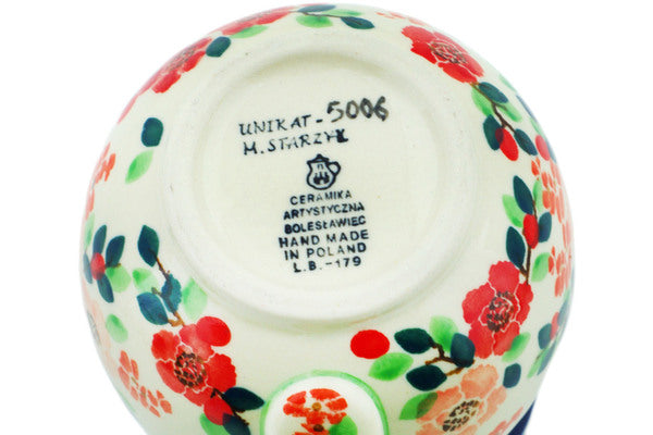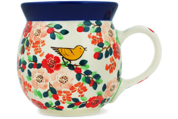 This Polish Pottery 16 oz Bubble Mug - Golden Sparrow In Rosy Petals is handmade and handpainted by the Ceramika Artystyczna factory in Boleslawiec, Poland.
