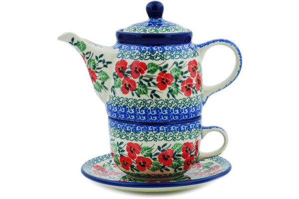 This Polish Pottery 17 oz Tea Set for One - Red Pansy is handmade and handpainted by the Ceramika Artystyczna factory in Boleslawiec, Poland.