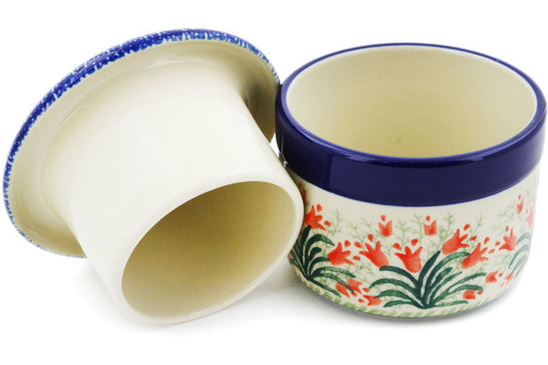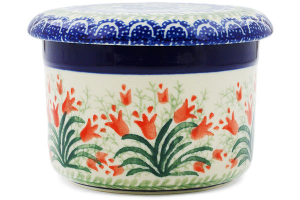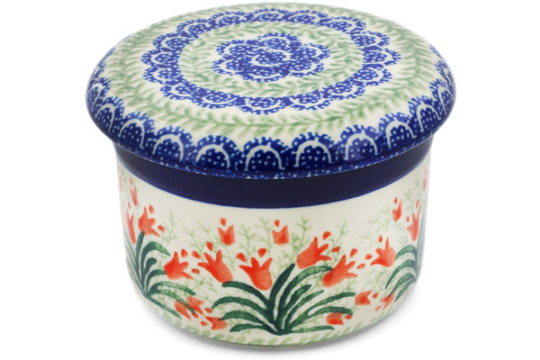 This Polish Pottery 4" Butter Dish - Crimson Bells is handmade and handpainted by the Ceramika Artystyczna factory in Boleslawiec, Poland.