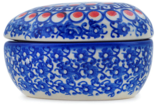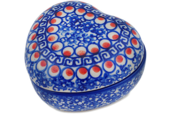 This Polish Pottery 4" Heart Shaped Jar - Floral Peacock is handmade and handpainted by the Ceramika Bona factory in Boleslawiec, Poland.