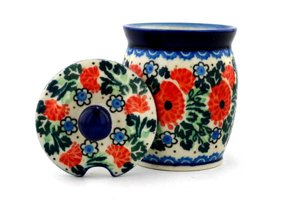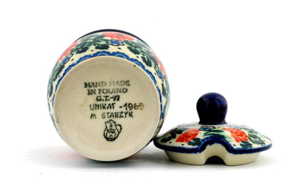 This Polish Pottery 4" Jar with Lid with Opening - Orange Carnation Garden is handmade and handpainted by the Ceramika Artystyczna factory in Boleslawiec, Poland.