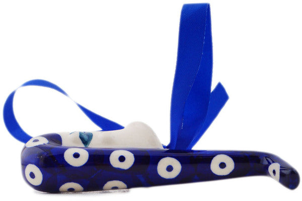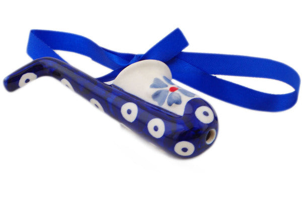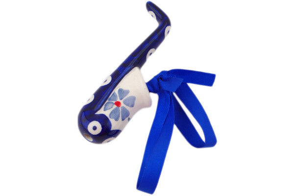 This Polish Pottery 4" Saxophone Ornament - Peacock Forget-Me-Not is handmade and handpainted by the Manufaktura factory in Boleslawiec, Poland.