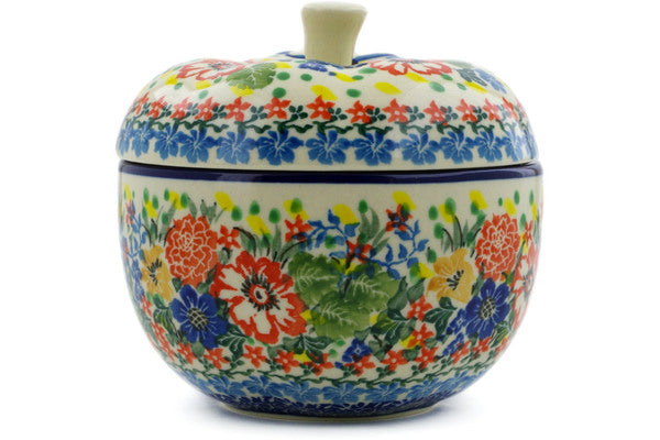 This Polish Pottery 5" Apple Shaped Jar - Hummingbird Meadow is handmade and handpainted by the Ceramika Artystyczna factory in Boleslawiec, Poland.