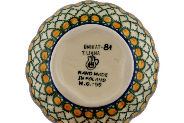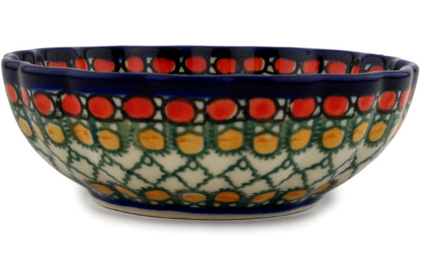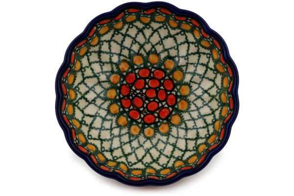 This Polish Pottery 5" Scalloped Fluted Bowl - Orange Tranquility is handmade and handpainted by the Ceramika Artystyczna factory in Boleslawiec, Poland.