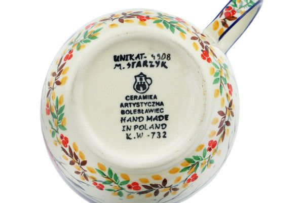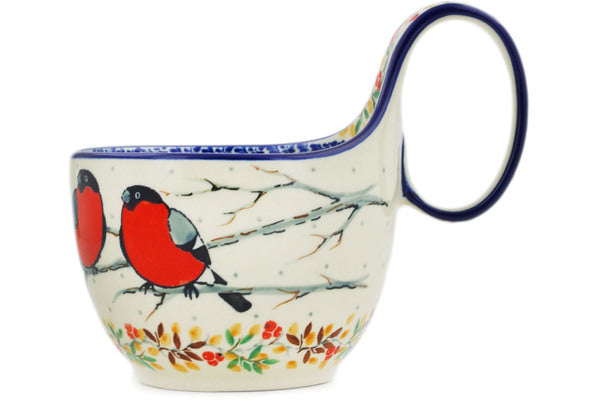 This Polish Pottery 6" Bowl with Loop-Handle - Bullfinch On Rowan is handmade and handpainted by the Ceramika Artystyczna factory in Boleslawiec, Poland.