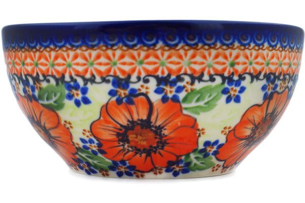 This Polish Pottery 6" Bowl - Orange Zinnia is handmade and handpainted by the Ceramika Nina factory in Boleslawiec, Poland.