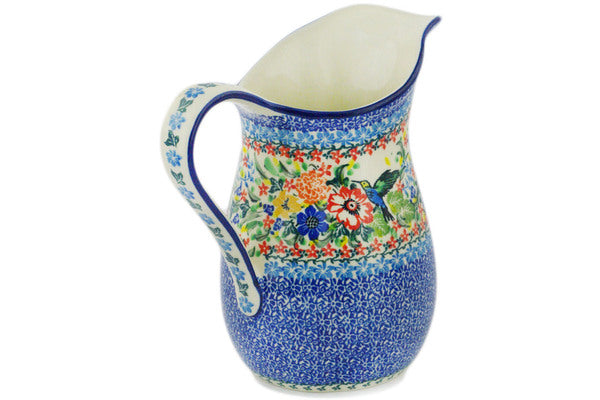 This Polish Pottery 51 oz Pitcher - Hummingbird Meadow is handmade and handpainted by the Ceramika Artystyczna factory in Boleslawiec, Poland.