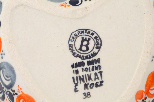 This Polish Pottery 6" Heart Shaped Bowl - Red Peacock Eye is handmade and handpainted by the Ceramika Bona factory in Boleslawiec, Poland.