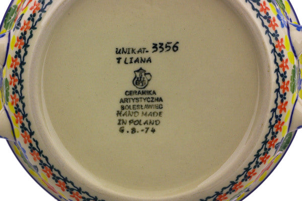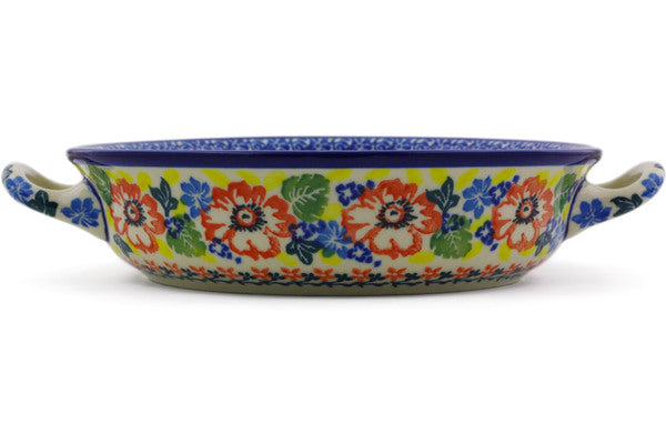 This Polish Pottery 8" Round Baker with Handles - Hummingbird Meadow is handmade and handpainted by the Ceramika Artystyczna factory in Boleslawiec, Poland.