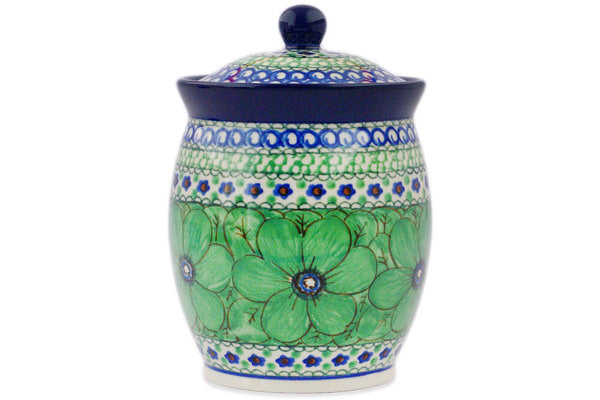 This Polish Pottery 6" Jar with Lid - Green Pansies is handmade and handpainted by the Ceramika Artystyczna factory in Boleslawiec, Poland.