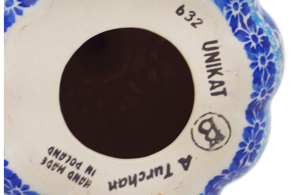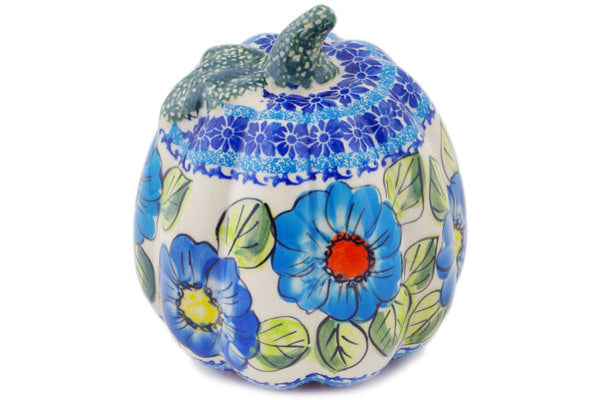 This Polish Pottery 6" Pumpkin Figurine - Bold Blue Poppies is handmade and handpainted by the Ceramika Bona factory in Boleslawiec, Poland.