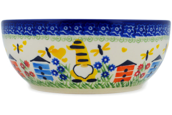 This Polish Pottery 7" Bowl - Beekeeper Gnome is handmade and handpainted by the Ceramika Nina factory in Boleslawiec, Poland.
