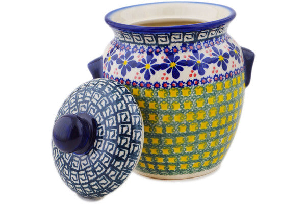 This Polish Pottery 7" Jar with Lid and Handles - Irish Spring is handmade and handpainted by the Ceramika Bona factory in Boleslawiec, Poland.
