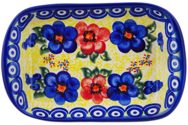 This Polish Pottery 7" Platter with Handles - Neon Poppies is handmade and handpainted by the Ceramika Bona factory in Boleslawiec, Poland.