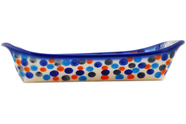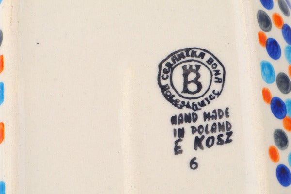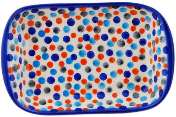 This Polish Pottery 7" Platter with Handles - Polka Dot Frenzy is handmade and handpainted by the Ceramika Bona factory in Boleslawiec, Poland.
