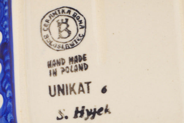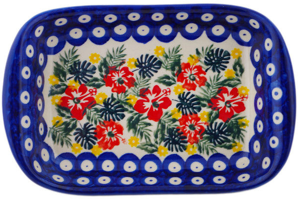 This Polish Pottery 7" Platter with Handles - Tropical Peacock is handmade and handpainted by the Ceramika Bona factory in Boleslawiec, Poland.
