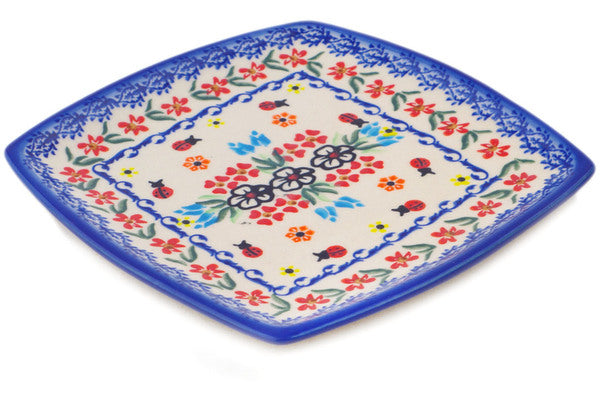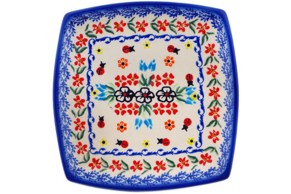 This Polish Pottery 7" Square Plate - Fanciful Ladybug is handmade and handpainted by the Ceramika Bona factory in Boleslawiec, Poland.