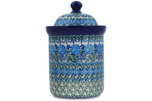 This Polish Pottery 8" Cookie Jar - Blue Rose Trellis is handmade and handpainted by the Ceramika Artystyczna factory in Boleslawiec, Poland.