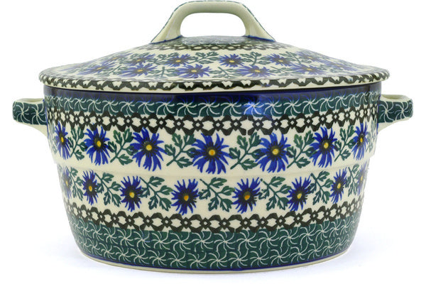 This Polish Pottery 9" Baker with Cover with Handles - Blue Chicory is handmade and handpainted by the Ceramika Artystyczna factory in Boleslawiec, Poland.
